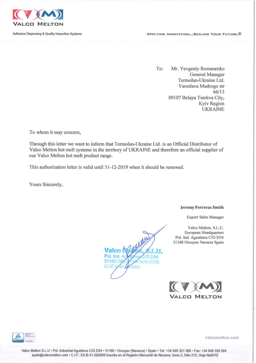 Оригінальні Клейові шланги поставляються іспанською фірмою Valco Melton. Компанія "Термолан - Україна" офіційний представник Valco Melton в Украине.